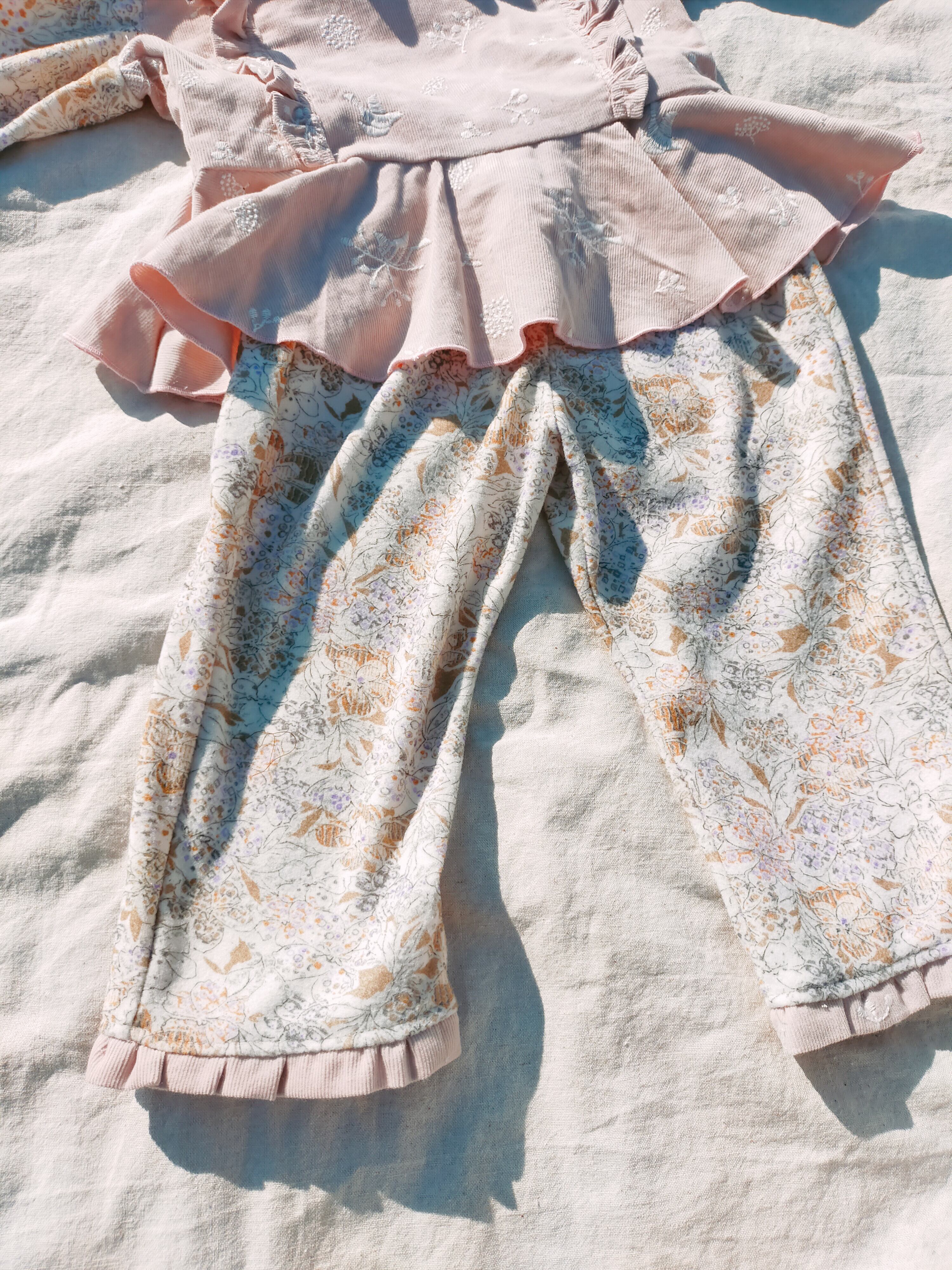 花柄ニットパンツコーデュロイフリル(セットアップ可能)/pink corduroy frilled and flower printed knit pants