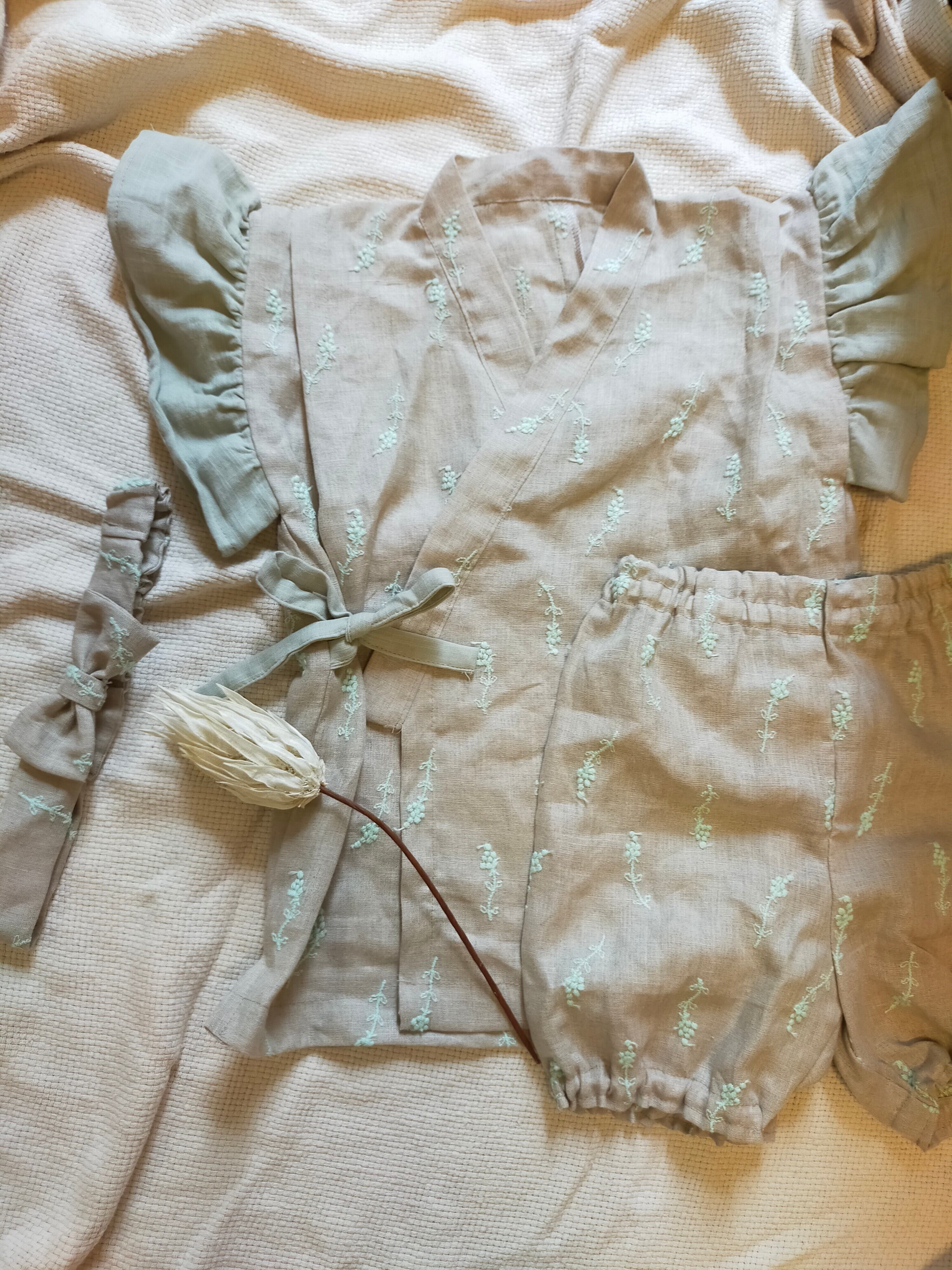 ミントフラワー刺繍リネンベース甚平上下 + ヘッドアクセサリー 3点セット