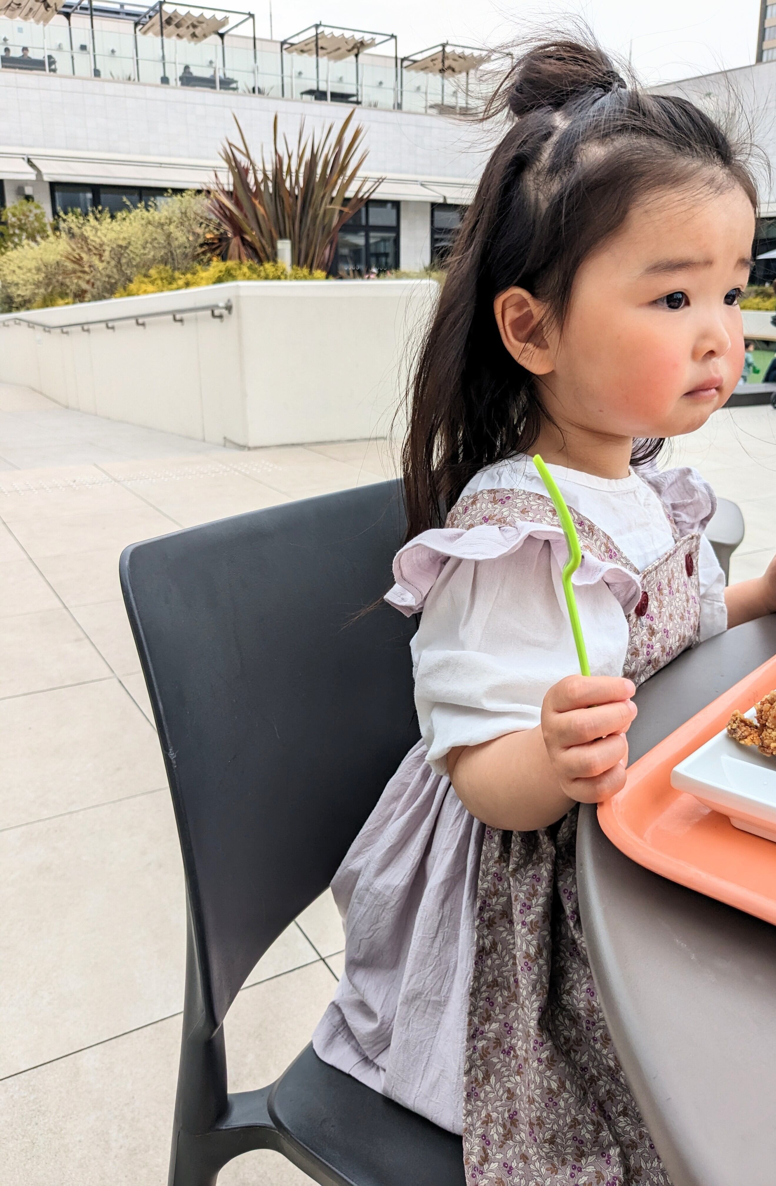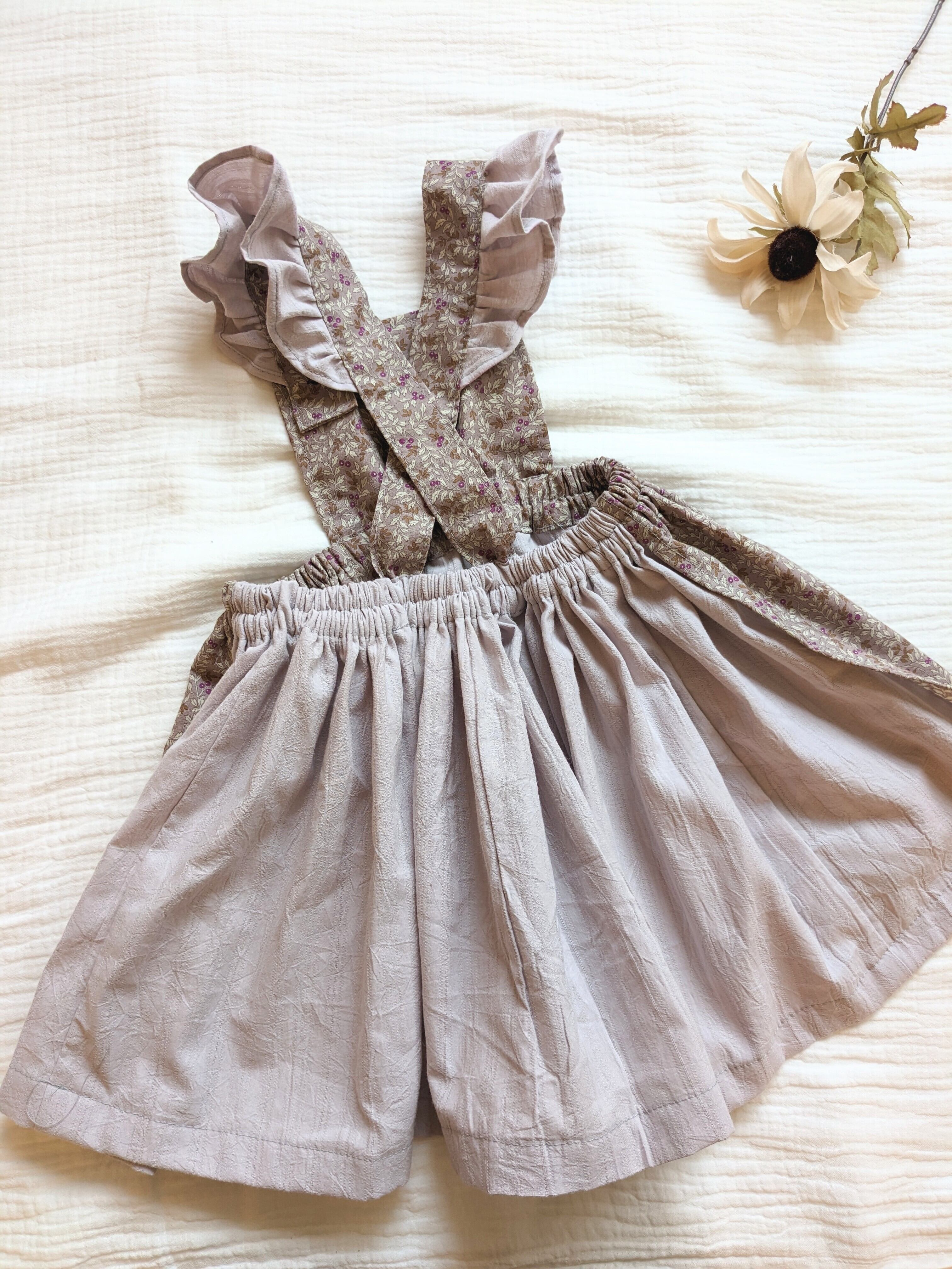 ライラック色のエプロン風ワンピースです。